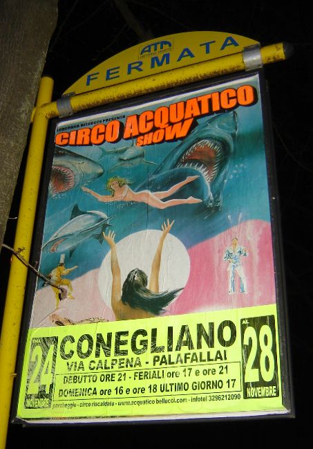 April 2006 Walking round Treviso, in Northern Italy looking for something to do, then I see an advert for a Shark Circus. Now I remember even as a kid in Wales going to the circus was never quite as thrilling as it was supposed to be, but here was a real thrill advertised. Have a look at the advert to the left (click on it and see it bigger), it's a Circus where women get thrown in with Great White Sharks, isn't it? How cool is that? Unfortunately the circus wasn't in town tonight so I'd have to miss it.... can anyone tell me what happens in a shark circus? Do people really just swim around then get eaten? That's so cool. |