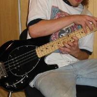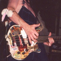 I've got a Warwick Thumb Bass for funky silly stuff like Sack Trick and a Musicman Sterling Bass for ROCK! I use Bass Centre Elite Strings (40-100 on the Warwick, 45-105 on the Musicman). Live they go through (in this order), a DOD Envelope Filter (for very silly wah sounds), a RAT distortion and a Boss Stage Tuner. Sometimes I'll put a DOD Bass Compressor in line too, especially if I'm going through strange amps. Usually with Sack Trick live I use my shiny new Warwick amp with all the controls set at ten (except the master volume) through an old 4x10 cabinet that farts on the note 'B'. I'm not that fussy with amps onstage, they're only monitors the real sound out front as with recording is from a Direct Input box. |