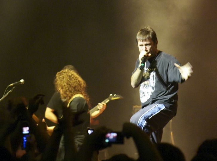 Chris Dale and Frank Schieber onstage with Brice Dickinson