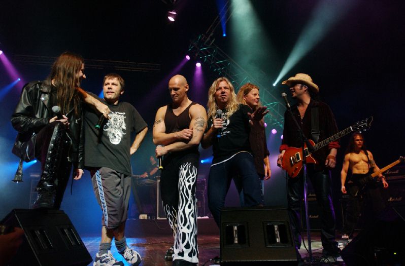 Renato Tribuzy, Bruce Dickinson, Ralf Scheepers, Mat Sinner, Roland Grapow, Roy Z and Gustavo Silvera onstage